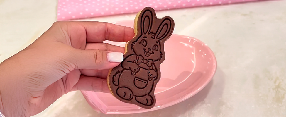 Utilizando cortadores com carimbo, os biscoitos ganham acabamento padronizado e detalhes marcantes, valorizando o visual final e agregando valor ao produto. É uma excelente alternativa para quem deseja ampliar o portfólio de Páscoa com itens diferenciados.